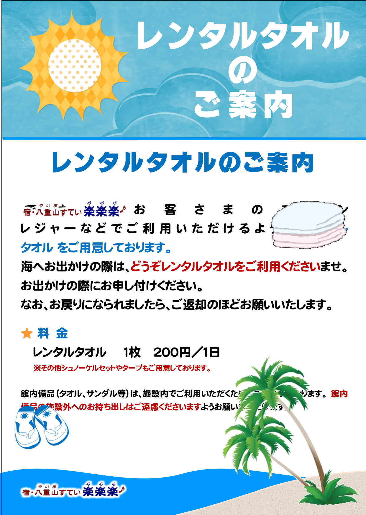 施設外にてタオルをご利用の場合は、レンタルタオル(有料/1日1枚 200円)をご用意しております。